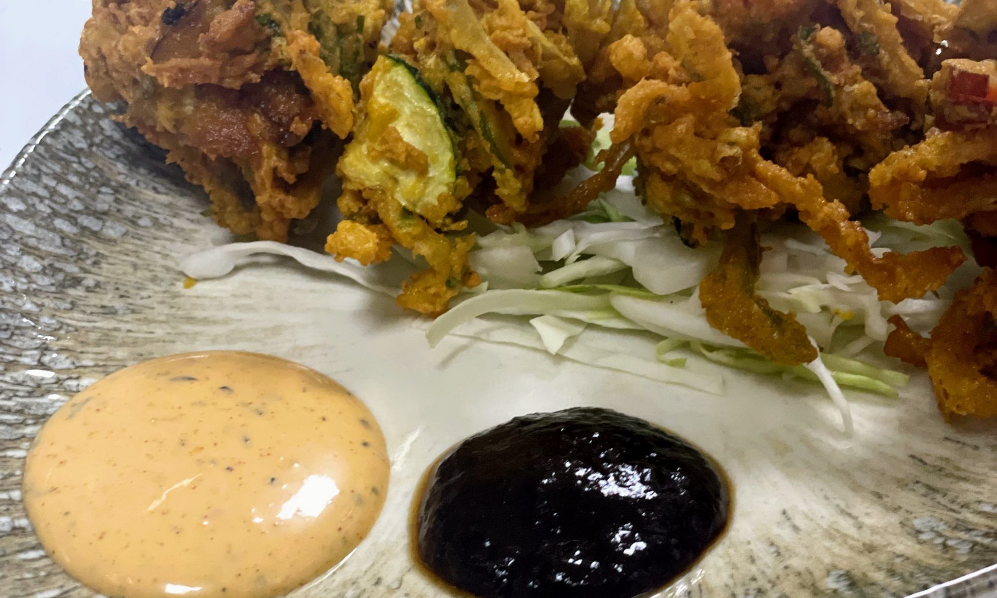 Fresh seasonal vegetables, covered in chickpea flour, fried for a crispy touch, served with tamarind sauce and chili sauce